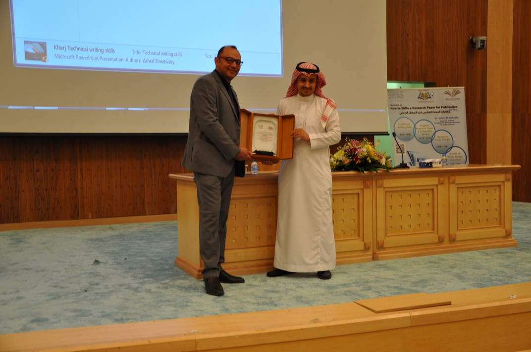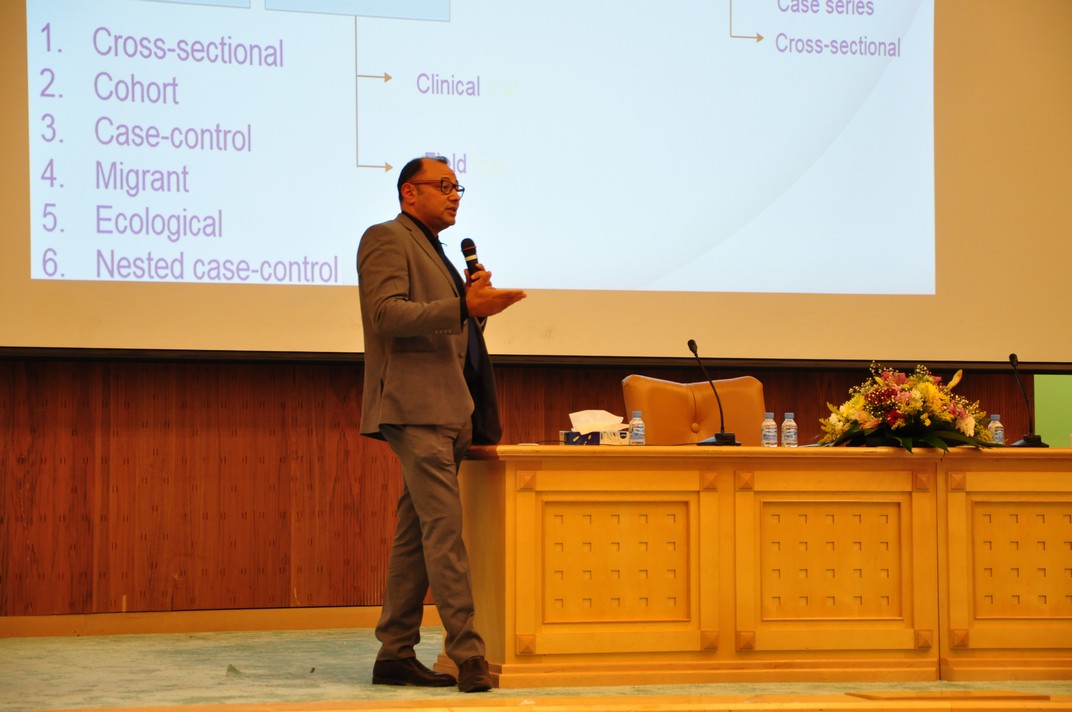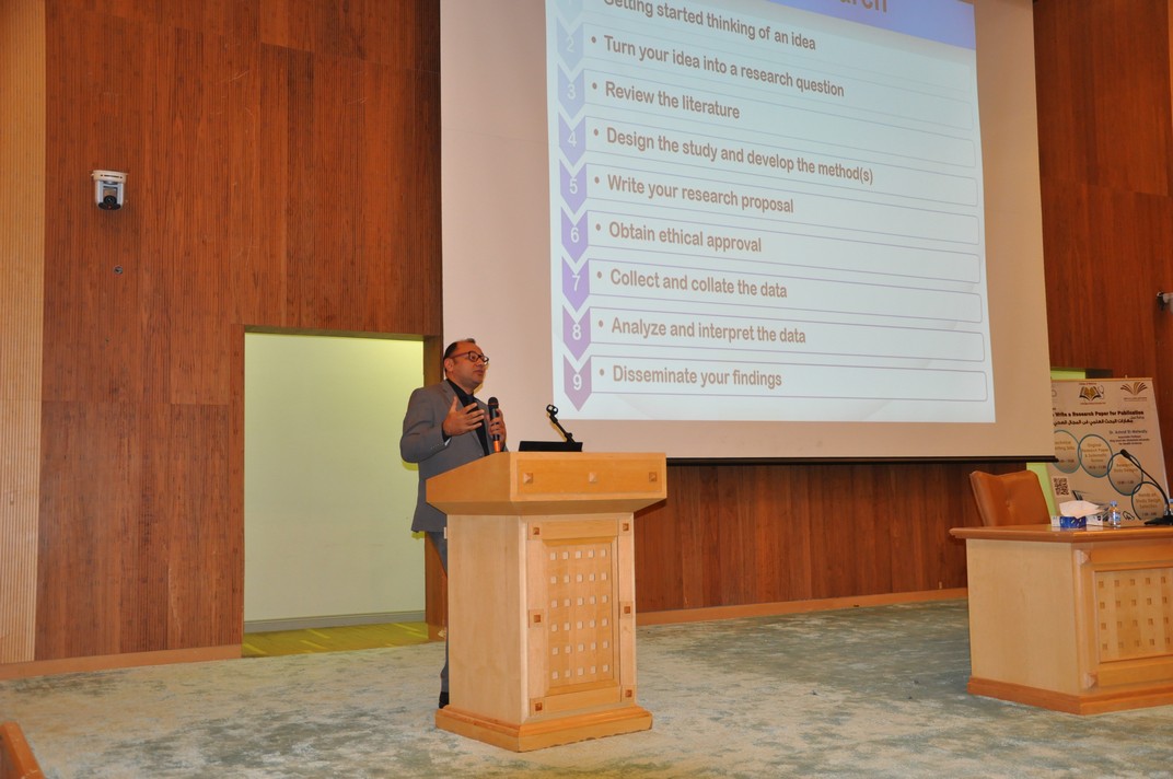 عقدت كلية الطب ممثلة بوكالة الكلية للدراسات العليا و التعليم الطبي المستمر ورشة عمل تحت عنوان (مهارات البحث العلمي في المجال الصحي) يوم الاربعاء الموافق 22 نوفمبر 2017 وذلك بمقر قاعة الاحتفالات والمؤتمرات بالمدينة الجامعية , وقام بتقديم ورشة العمل سعادة الدكتوراشرف المتولي عضو هيئة التدريس و الاستاذ المشارك بجامعة الملك سعود بن عبد العزيز للعلوم الصحية.